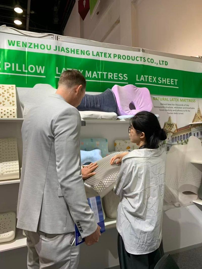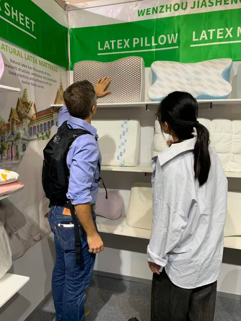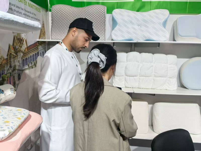 Bu Dubai Uyku Fuarı'nda uyku odaklı yastıklarımızı dünyanın dört bir yanından gelen ziyaretçilere göstermekten onur duyuyoruz. Piyasadaki en çok satan yastıklardan ikisini sunmaya kendimizi adadık:doğal lateks yastıkve modern akıllı malzemehafızalı köpük yastık. Lateksin hızlı toparlanma ve anti-alerji özellikleri, lateks meraklıları tarafından oldukça tercih edilmektedir. Bu arada hafızalı köpüğün mükemmel uyumu derin uyku sağlayabilir. Müşterilerimizle sahadaki derin iletişimimiz, onların yastık arayışını bize hissettirdi. Farklı uyku alışkanlıkları için kişiselleştirilmiş seçenekler sunmanın kaliteli uykunun anahtarı olduğuna inanıyoruz.